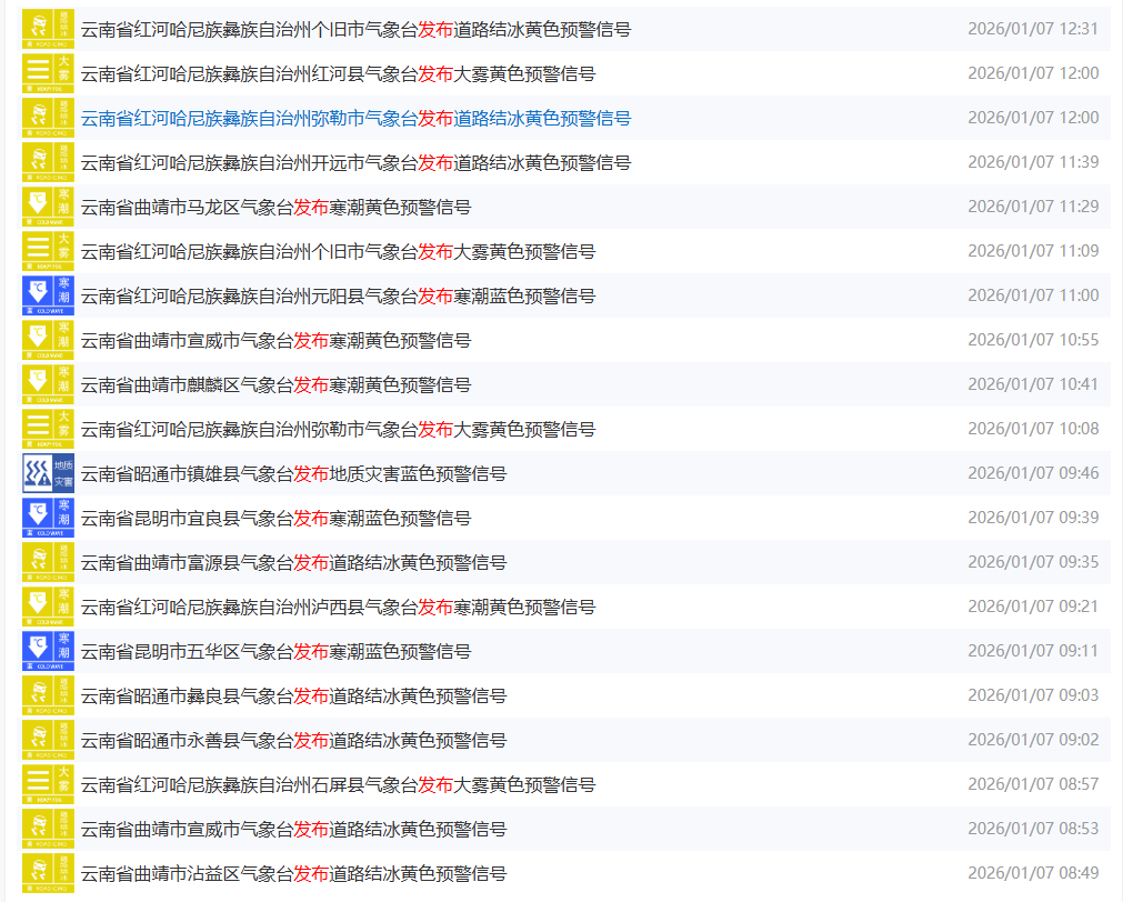 1月7日8时至12时,各级景象形象部分累计发布16条道结冰预警,此中以预警为从,个旧、曲靖、开远、昭通等多地纳入预警范畴;同时发布7条寒潮蓝色预警。