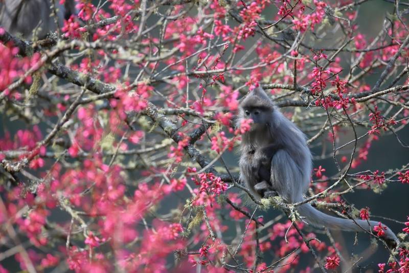 每年11月至次年1月,冬樱花正在云南山国度级天然区景东片区里怒放,国度一级沉点野活泼物印支灰叶猴携家带口采食樱花。