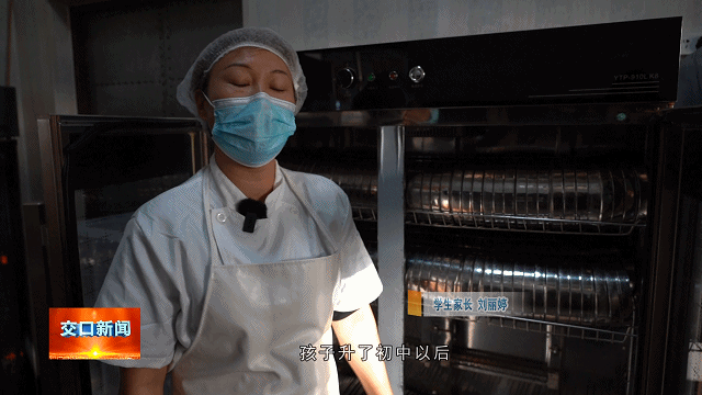 孩子升了初中当前,为了更好的照应孩子,我就来到学校帮厨。我次要担任餐具的清洗和消毒,我要孩子们的餐具卫生、安心。