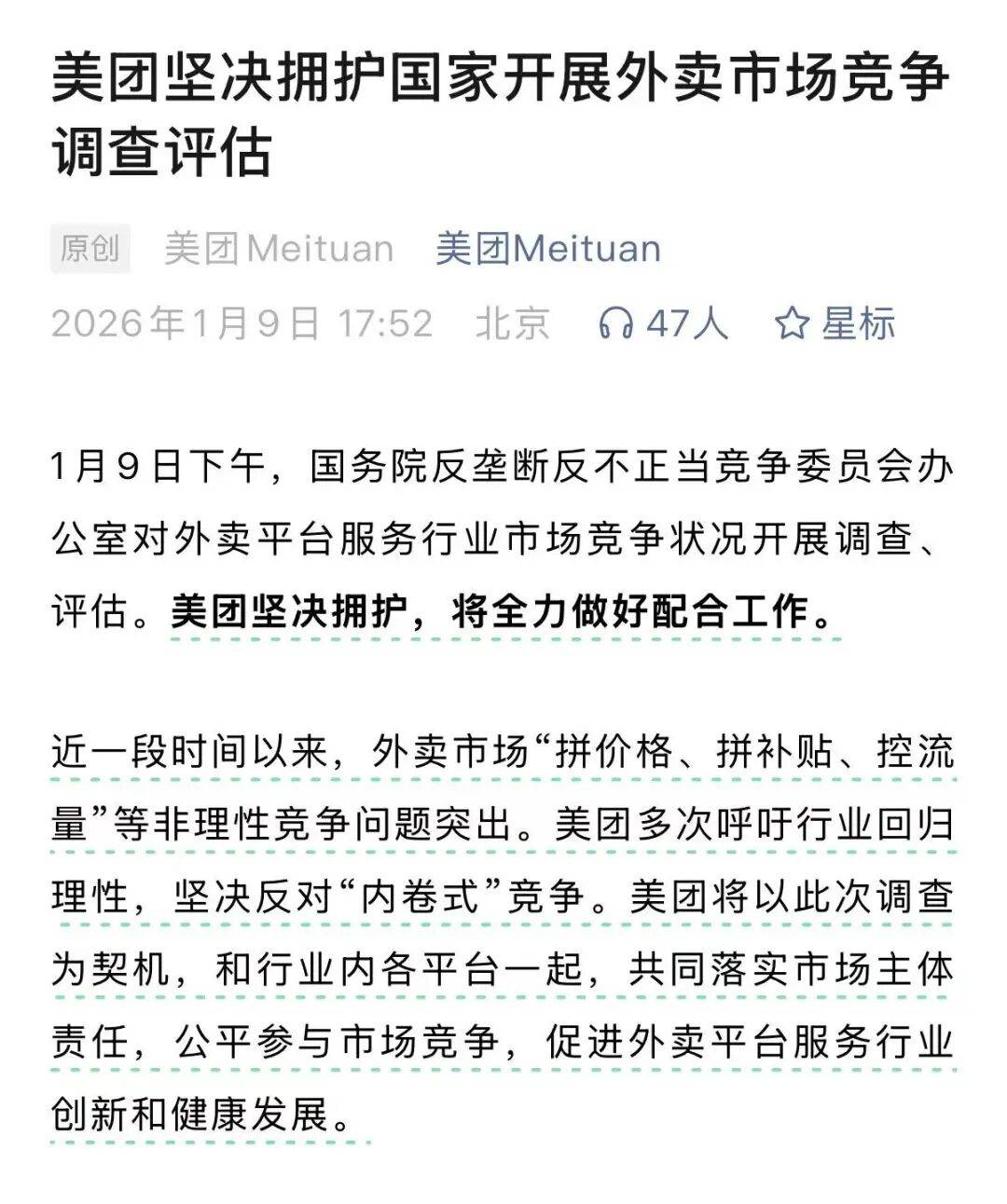 市场监管总局1月9日动静,国务院反垄断反不合理合作委员会办公室相关担任同志暗示,外卖平台办事行业拼补助、拼价钱、控流量等问题凸起,挤压实体经济,加剧行业“内卷式”合作,社会各方面反映强烈。为鞭策外卖平台依法合规运营、公允有序合作,构成优良优价、良性合作的市场次序,国务院反垄断反不合理合作委员会办公室根据《中华人平易近国反垄断法》,决定对外卖平台办事行业市场所作情况开展查询拜访、评估。本次查询拜访评估是国务院反垄断反不合理合作委员会办公室表达合作关心、评估垄断风险、规范市场次序的主要行动,将通过现场核实、当面、问卷查询拜访等体例,深切领会外卖平台合作行为,普遍听取平台内运营者、新就业群体、消费者等各方看法,全面查询拜访市场所作情况,传导监管压力,提出措置办法。外卖平台要积极共同市场查询拜访、评估工做,严酷落实反垄断合规从体义务,无效防备化解垄断风险,公允参取市场所作,推进外卖平台办事行业立异和健康成长。美团暗示,,将全力做好共同工做。美团多次呼吁行业回归,否决“内卷式”合作。和行业内各平台一路,配合落实市场从体义务,公允参取市场所作,推进外卖平台办事行业立异和健康成长。