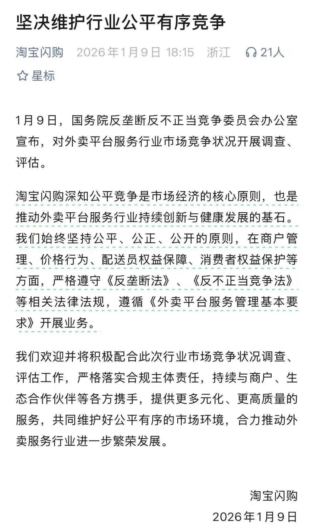 淘宝闪购暗示,行业公允有序合作,欢送并将积极共同此次行业市场所作情况查询拜访、评估工做,严酷落实合规从体义务,持续取商户、生态合做伙伴等各方联袂,供给更多元化、配合好公允有序的市场,合力鞭策外卖办事行业进一步繁荣成长。